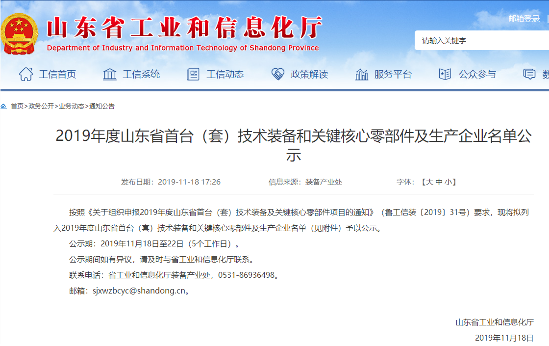 2019年度山東省首臺(tái)(套)技術(shù)裝備和關(guān)鍵核心零部件及生產(chǎn)企業(yè)名單公示