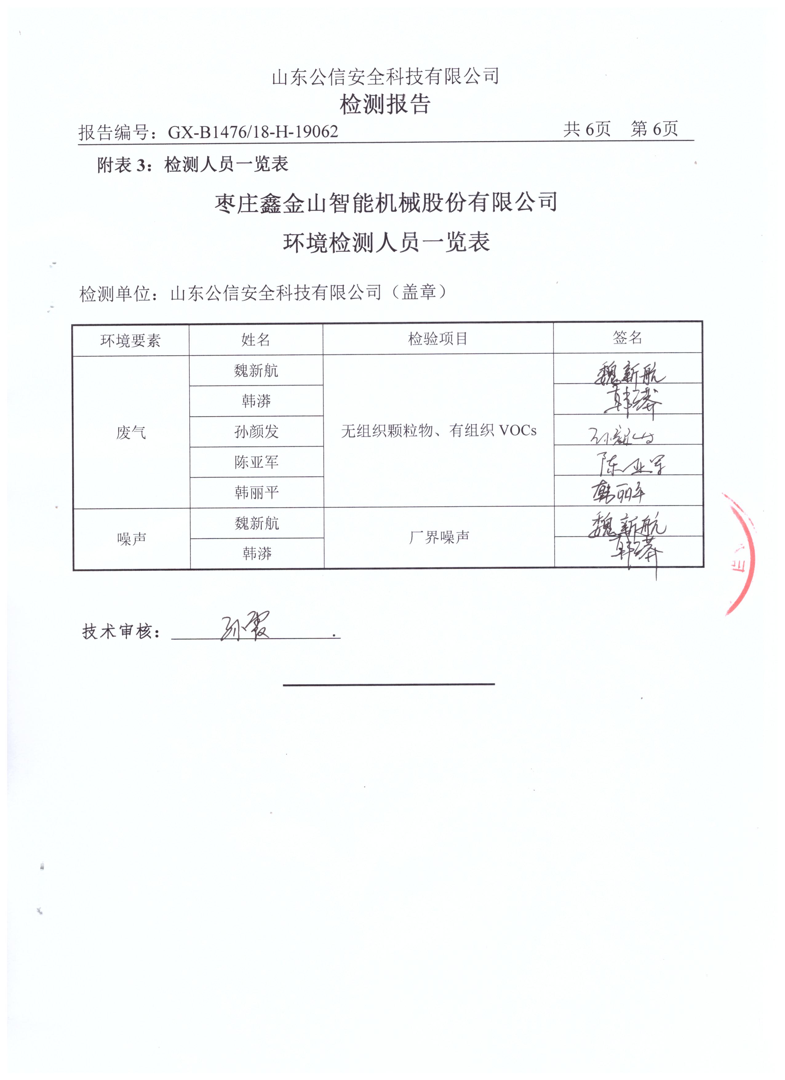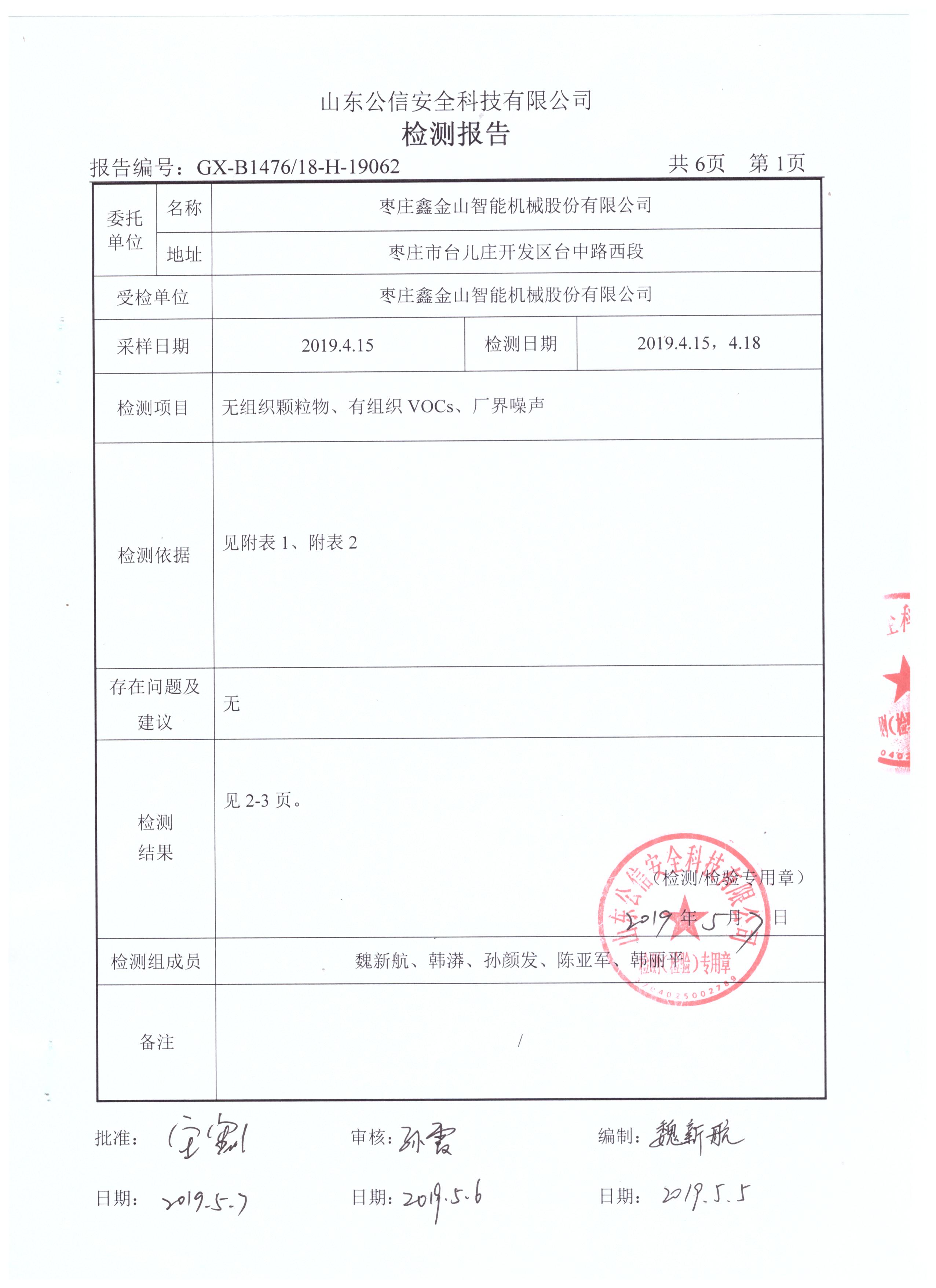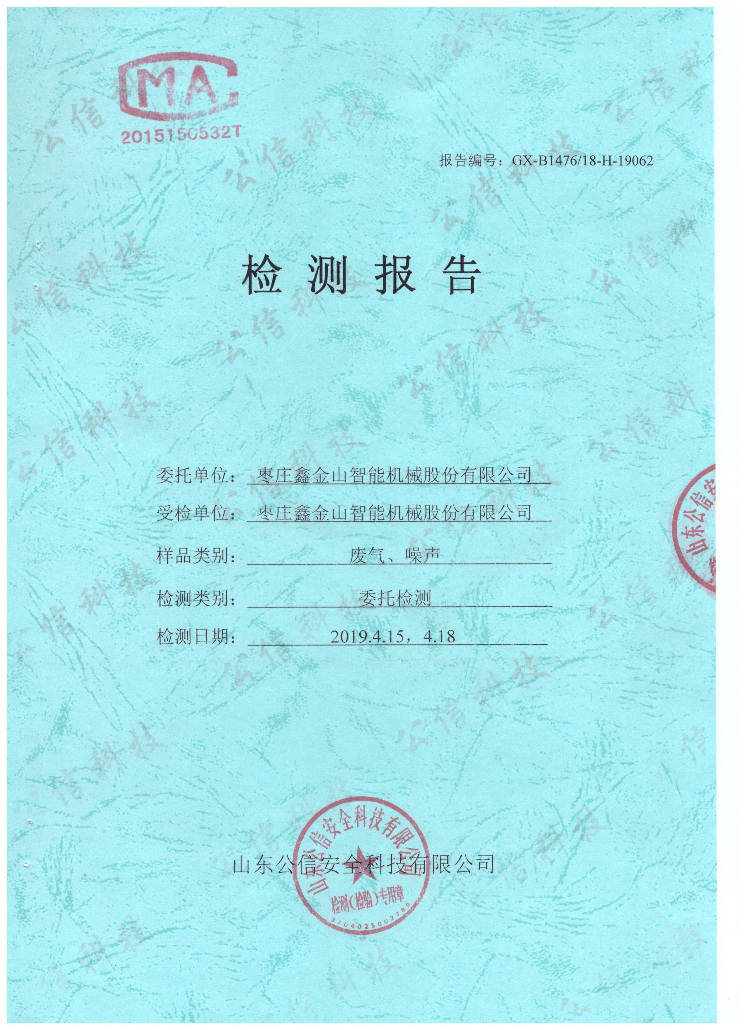 導(dǎo)讀:受檢單位:棗莊鑫金山智能機(jī)械股份有限公司 委托單位:山東公信安全科技有限公司 檢測日期:2019.4.15 2019.4.18