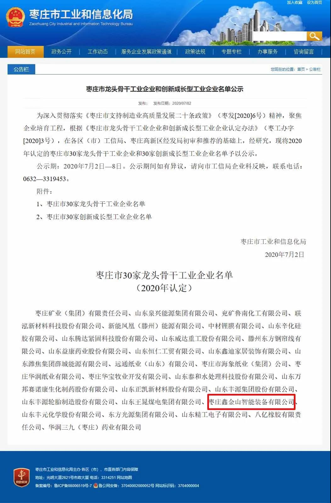 導(dǎo)讀:近日,從棗莊市工業(yè)和信息化局傳來喜訊,正式公示了2020年棗莊市龍頭骨干工業(yè)企業(yè)和創(chuàng)新成長型工業(yè)企業(yè)名單以及棗莊市“1515”企業(yè)家人才名單,棗莊鑫金山智能裝備有限公司榜上有名,成功榮獲“棗莊市龍頭骨干企業(yè)”殊榮,董事長孫中巖榮獲棗莊市“1515”企業(yè)家榮譽(yù)稱號(hào)。