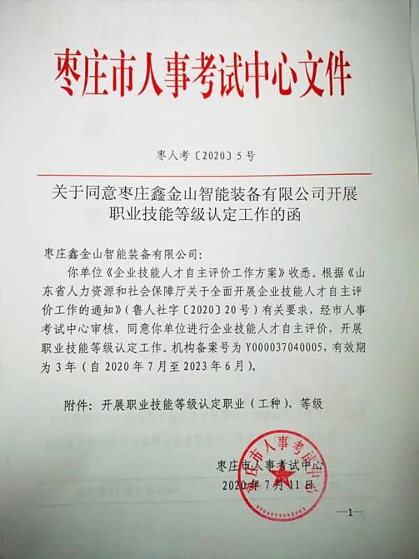 經(jīng)過評估審核,于今年7月中旬成功得到市人事考試中心的正式批復(fù),同意鑫金山進行企業(yè)技能人才自主評價,開展職業(yè)技能等級認定的工作。并取得自主開展車工、銑工、鏜工、沖壓工、鉗工、電工等8個職業(yè)(工種),5個等級的職業(yè)技能等級認定資質(zhì)。
