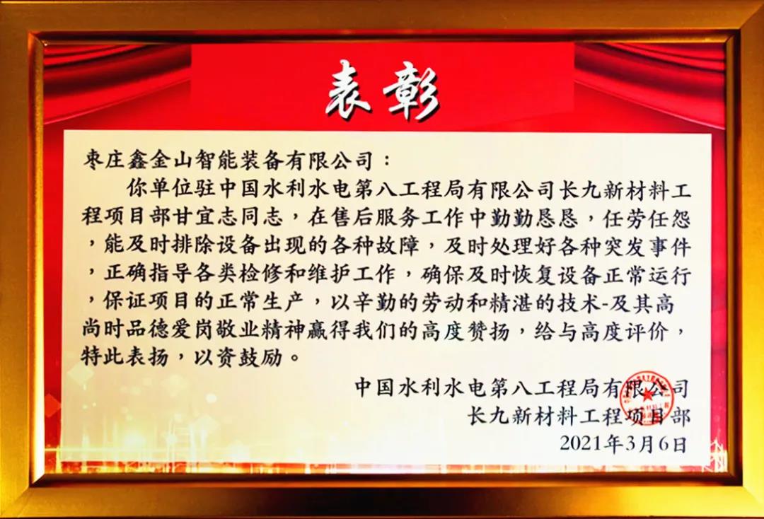 2021年春節(jié)期間,為了保證長九公司(神山項目)假期正常生產(chǎn),鑫金山客服中心決議就地過年。甘宜志經(jīng)理連續(xù)駐扎項目三個月不休息,在售后服務(wù)工作中勤勤懇懇,任勞任怨,及時處理突發(fā)事件,積極指導(dǎo)各類檢修和維護工作,確保及時恢復(fù)設(shè)備正常運行,保證項目的正常生產(chǎn)。甘宜志經(jīng)理以辛勤的勞動和精湛的技術(shù)及其高尚的愛崗敬業(yè)精神贏得了該項目業(yè)主的高度贊揚與評價,并贈予表彰信特此表揚。為雙方公司的再次合作奠定了良好的基礎(chǔ)。