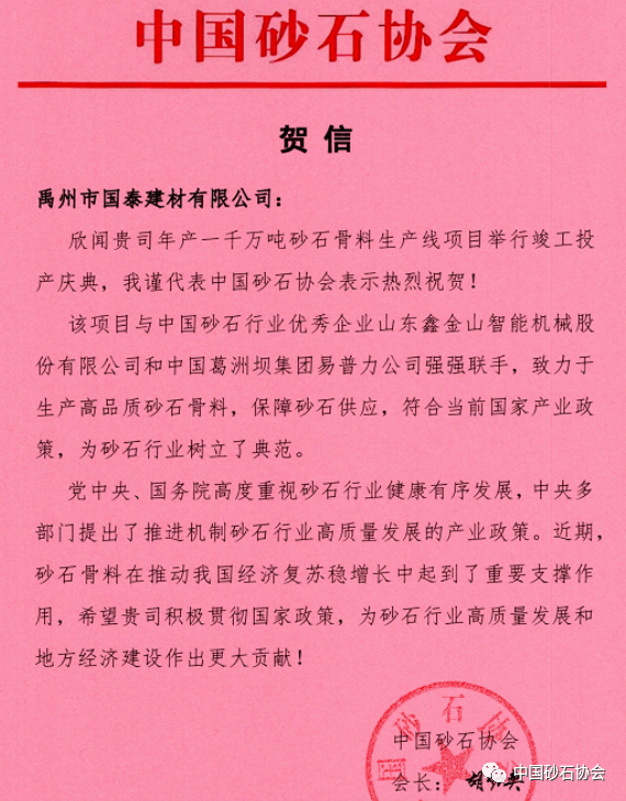 導(dǎo)讀:據(jù)中國砂石協(xié)會(huì)和中國砂石骨料網(wǎng)了解,2020年5月30日,禹州市國泰建材有限公司在河南省禹州市舉行年產(chǎn)1000萬噸砂石骨料生產(chǎn)線項(xiàng)目竣工投產(chǎn)慶典暨開業(yè)儀式,該項(xiàng)目投資2億余元,占地150余畝。慶典在行業(yè)“首創(chuàng)”采用現(xiàn)場(chǎng)直播方式。中國砂石協(xié)會(huì)會(huì)長胡幼奕發(fā)來賀信,對(duì)項(xiàng)目的竣工投產(chǎn)表示祝賀。