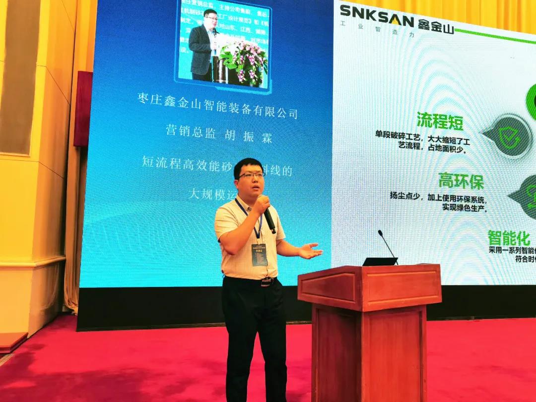在大會(huì)主題報(bào)告上,棗莊鑫金山營(yíng)銷總監(jiān)胡振霖作了題為《短流程高效能砂石骨料線的大規(guī)模應(yīng)用》的精彩報(bào)告演講。報(bào)告中,系統(tǒng)介紹了鑫金山獨(dú)特的短流程高效能砂石骨料生產(chǎn)線在行業(yè)中的大規(guī)模應(yīng)用。并以綠色礦山中綠色骨料線的“節(jié)能、環(huán)保、智能、集約”四大方面為核心,根據(jù)鑫金山時(shí)產(chǎn)600t—3000t的骨料線具體案例,詳細(xì)展示如何用EPC的方式建設(shè)一條符合綠色礦山要求的短流程高效能砂石骨料生產(chǎn)線。吸引了眾多與會(huì)嘉賓的高度關(guān)注。