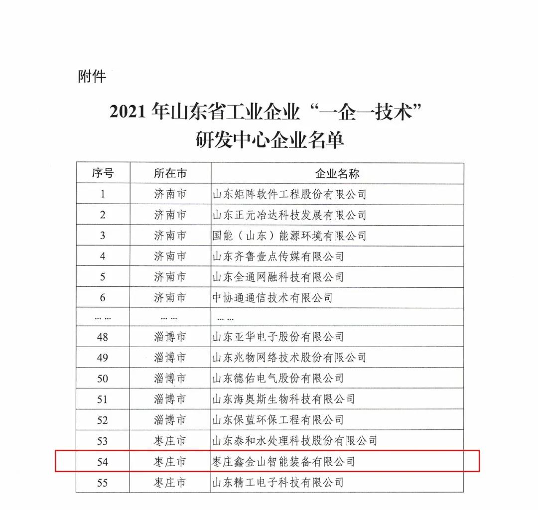 近日,山東省工業(yè)和信息化廳發(fā)布《關于公布2021年山東省工業(yè)企業(yè)“一企一技術”研發(fā)中心企業(yè)名單的通知》,棗莊鑫金山智能裝備有限公司成功入選,被認定為山東省“一企一技術”研發(fā)中心企業(yè)。這是繼院士工作站之后,鑫金山在技術研發(fā)領域獲得的又一項重要認定。