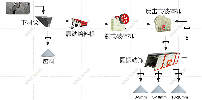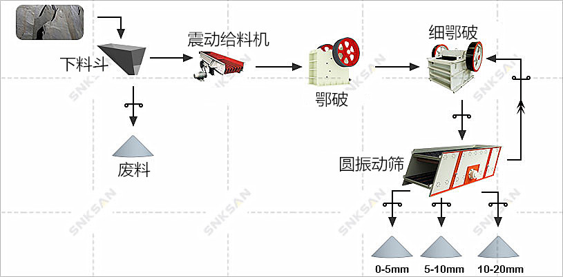 2.初級(jí)破碎階段。塊體首先被初級(jí)顎式破碎機(jī)破碎。在此階段,破碎比約為5:1,因此需要進(jìn)一步破碎。