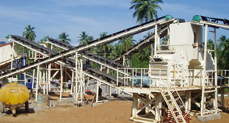 1.喂食階段。振動(dòng)給料機(jī)將原石塊均勻地送入初破顎式破碎機(jī)。