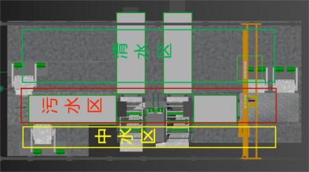 四合一集水平臺污水處理系統(tǒng),功能區(qū)域劃分,內部循環(huán)處理, 中水回用,每噸砂石僅補充水0.02t。當原料含泥量≤15%以內不用絮凝劑。